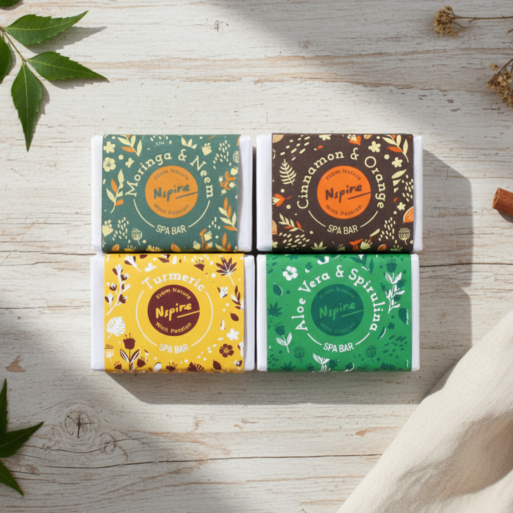 Nspire Spa Bar-Pack of 4 ( Cinnamon & Orange, Turmeric, Moringa & Neem, Aloe Vera & Spirulina)